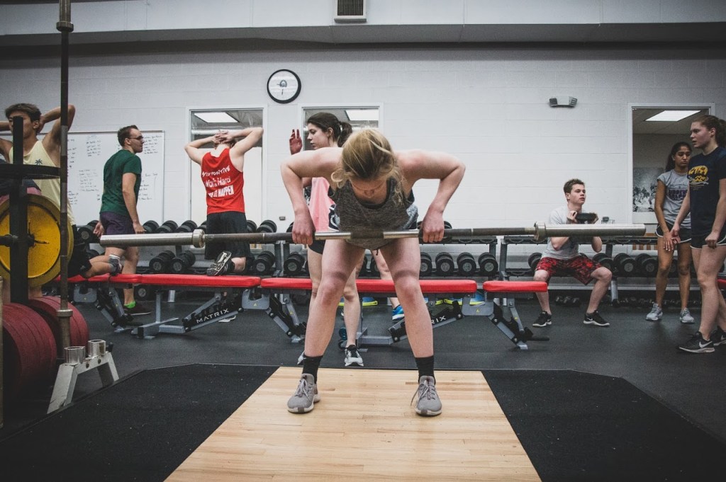 Video fades in from a black screen to a high school student lifting weights in the weight room. In the background you can hear the clinking noises of weights.